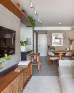 Os tons claros, como branco, bege, cinza suave e off-white, refletem melhor a luz natural e ampliam visualmente o ambiente, criando uma sensação de leveza e maior espaço. Além de contribuírem para uma estética clean e sofisticada, esses tons funcionam bem em paredes, móveis e objetos decorativos. Para dar um toque de personalidade, você pode inserir cores mais vibrantes em pequenos detalhes, como almofadas, quadros ou vasos e para trazer mais aconchego a madeira e tons amadeirados são grandes aliados