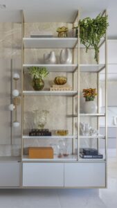 Em ambientes pequenos, as paredes podem se tornar grandes aliadas na organização e decoração. Aposte em prateleiras, nichos, ganchos e armários suspensos para armazenar objetos e liberar o espaço no chão. Além de funcionais, esses elementos ajudam a valorizar a altura do ambiente, criando a sensação de amplitude e verticalidade. É uma forma inteligente de unir praticidade e estilo.