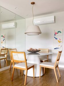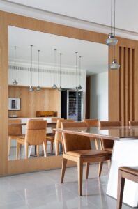 Espelhos são grandes aliados em ambientes pequenos. Quando bem posicionados — especialmente em frente a janelas ou fontes de luz — eles ampliam visualmente o espaço e trazem mais luminosidade ao ambiente. Um espelho grande em uma parede pode fazer milagres!